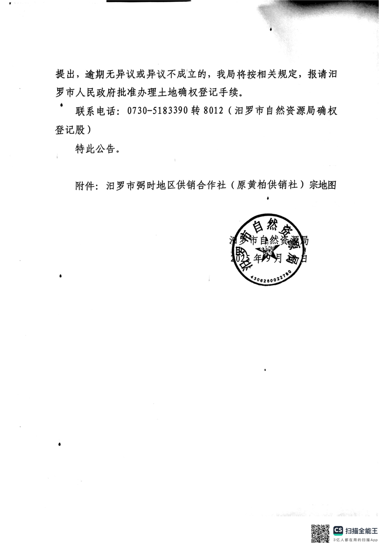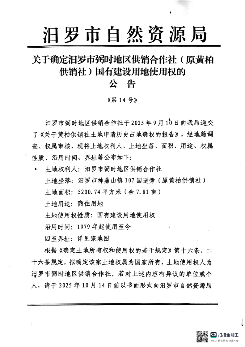 关于确定汨罗市弼时地区供销合作社(原黄柏供销社)国有建设用地使用权的公告