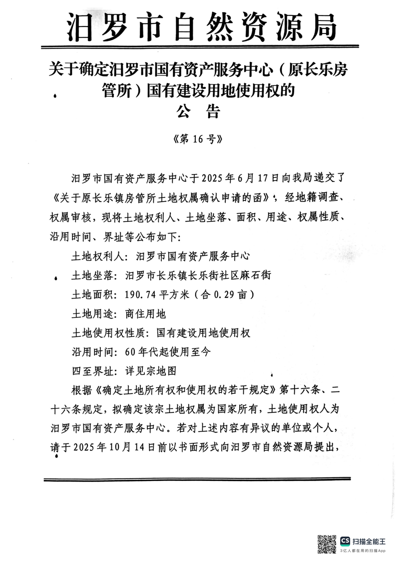 关于确定汨罗市国有资产服务中心(原长乐房管所)国有建设用地使用权的公告