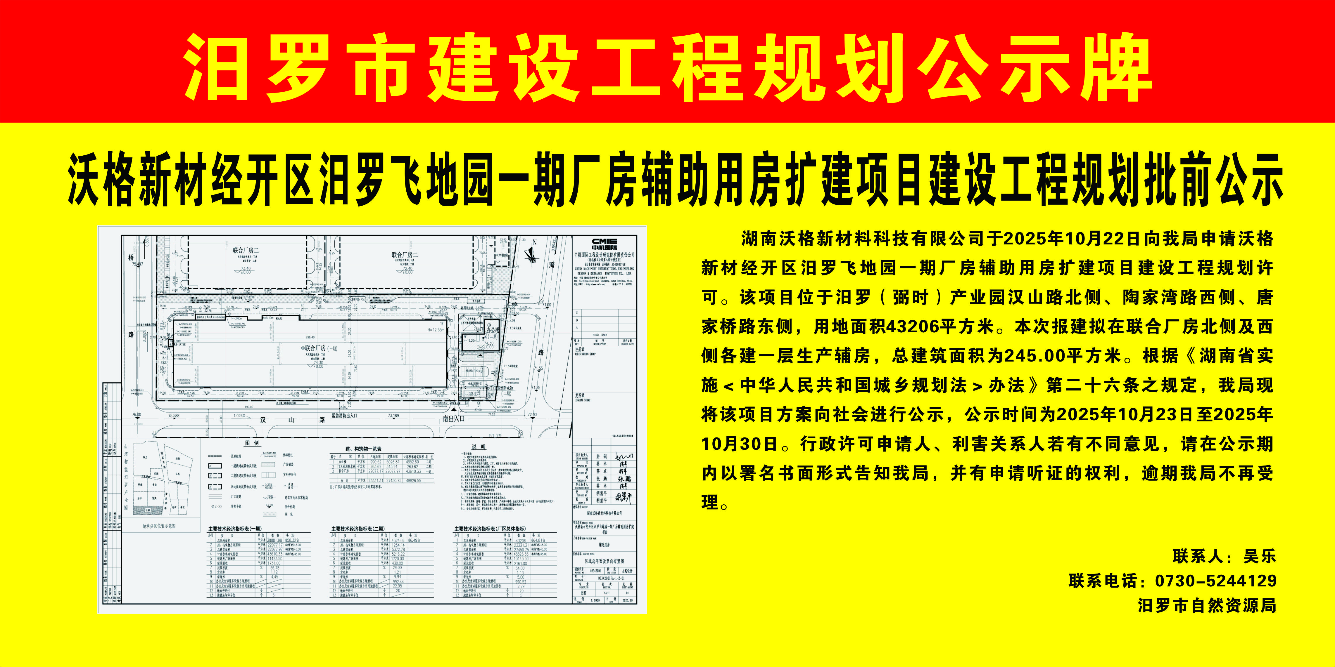 沃格新材经开区汨罗飞地园一期厂房辅助用房扩建项目建设工程规划批前公示