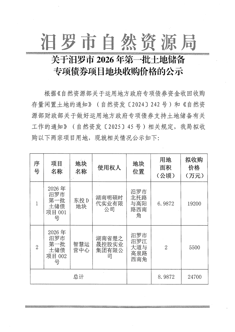 关于汨罗市2026年第一批土地储备专项债券项目地块收购价格的公示