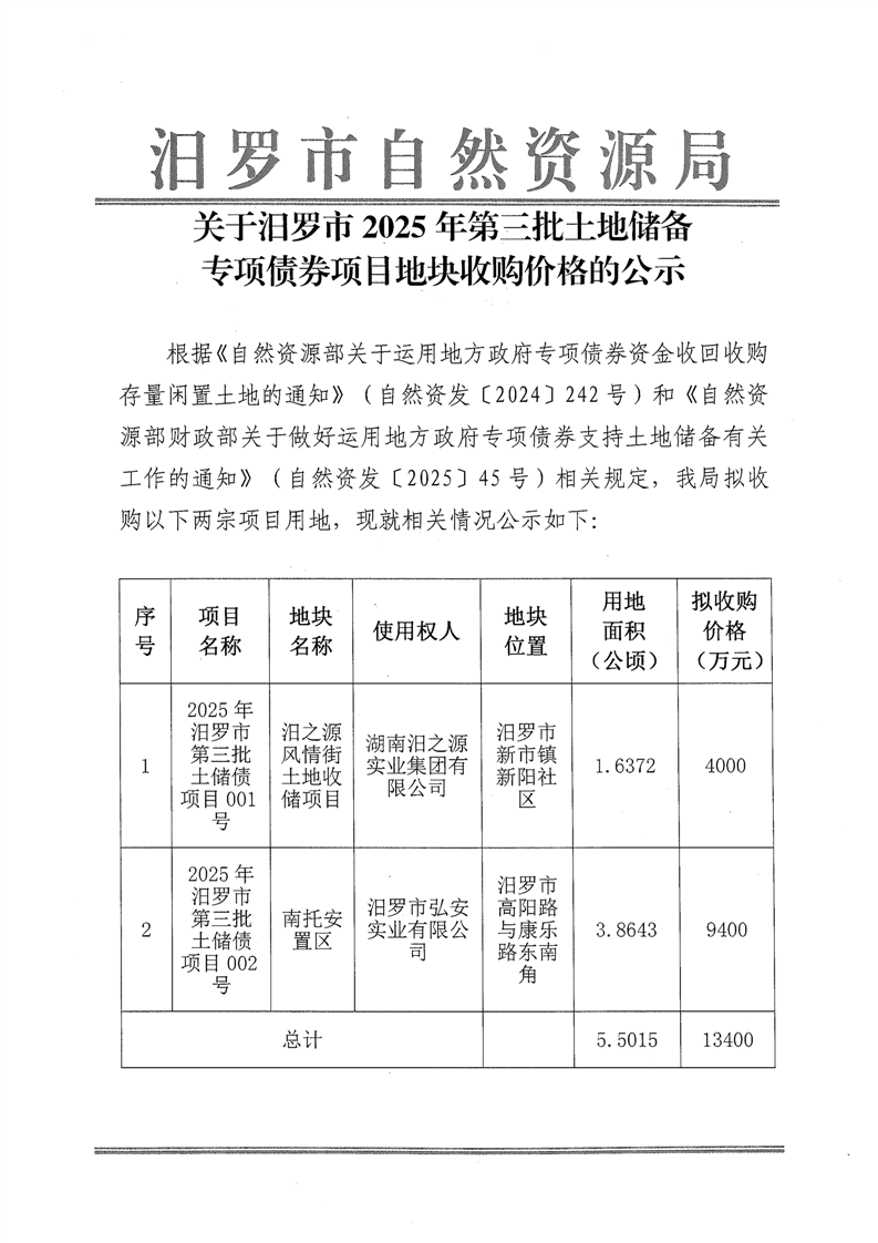 关于汨罗市2025年第三批土地储备专项债券项目地块收购价格的公示