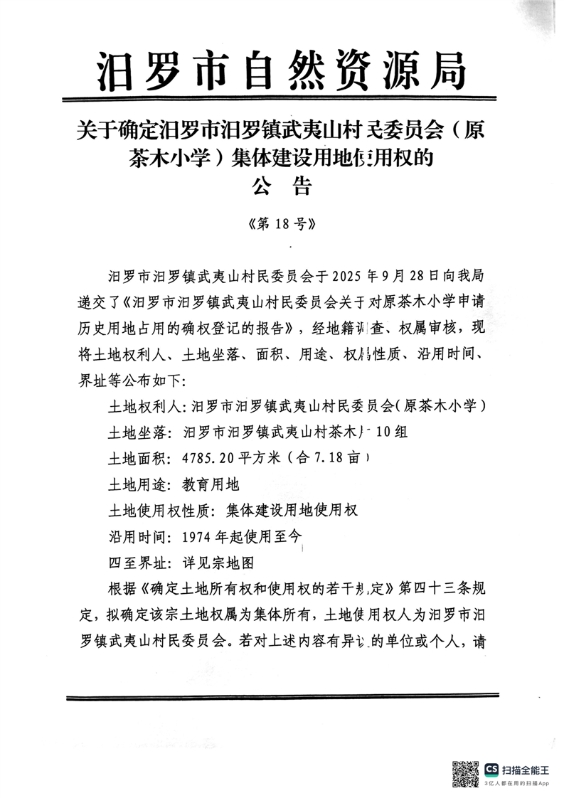 关于确定汨罗市汨罗镇武夷山村民委员会(原茶木小学)集体建设用地使用权的公告
