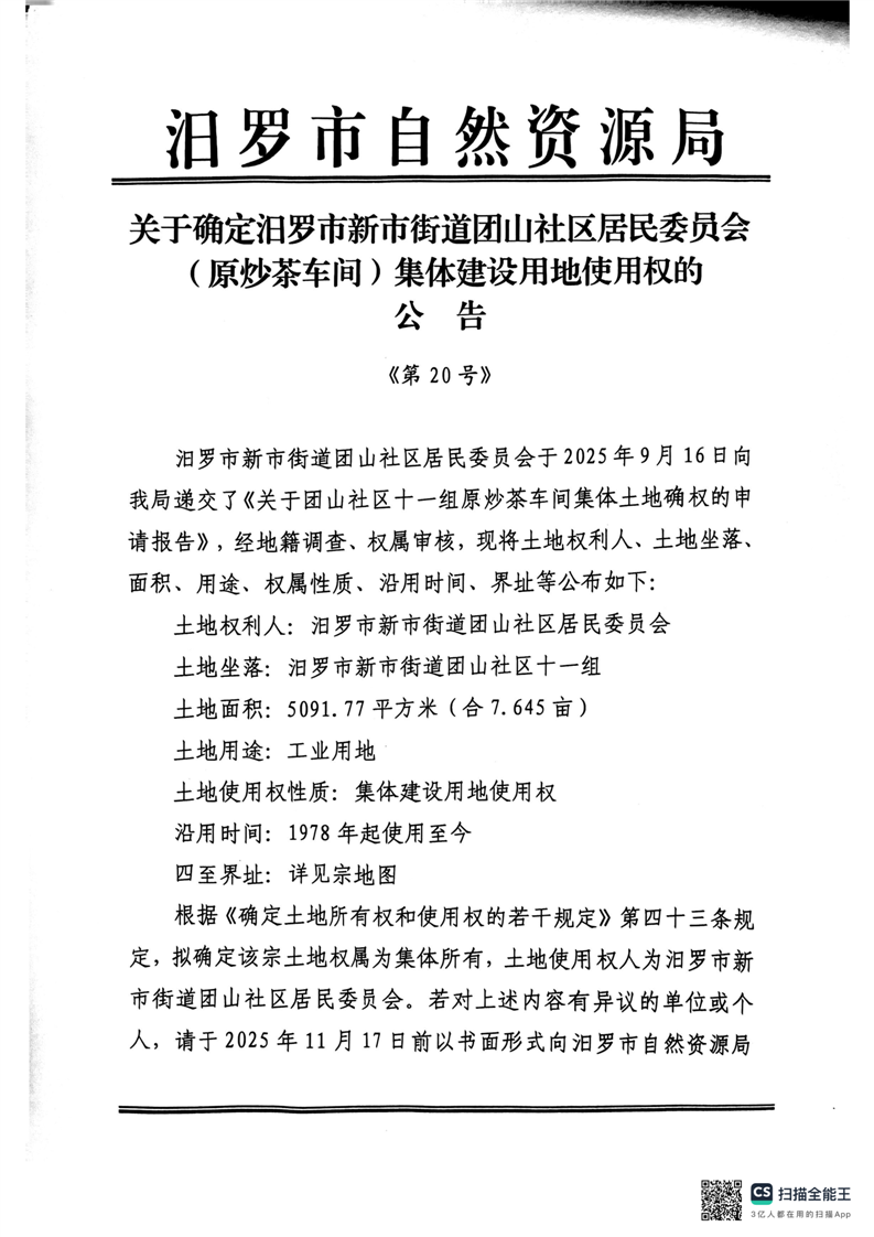 关于确定汨罗市新市街道团山社区(原炒茶车间)集体建设用地使用权的公告