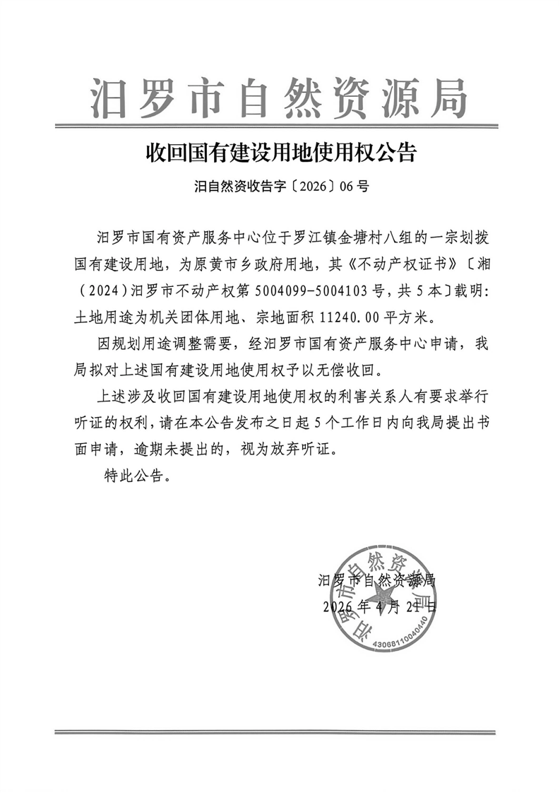 收回国有建设用地使用权公告 汨自然资收告字[2026)06号