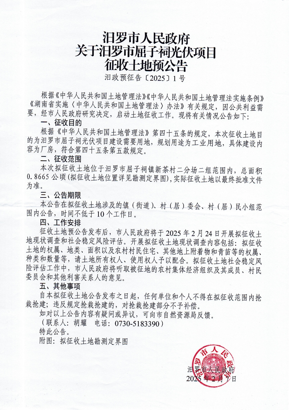 汨罗市人民政府关于汨罗市屈子祠光伏项目征收土地预公告