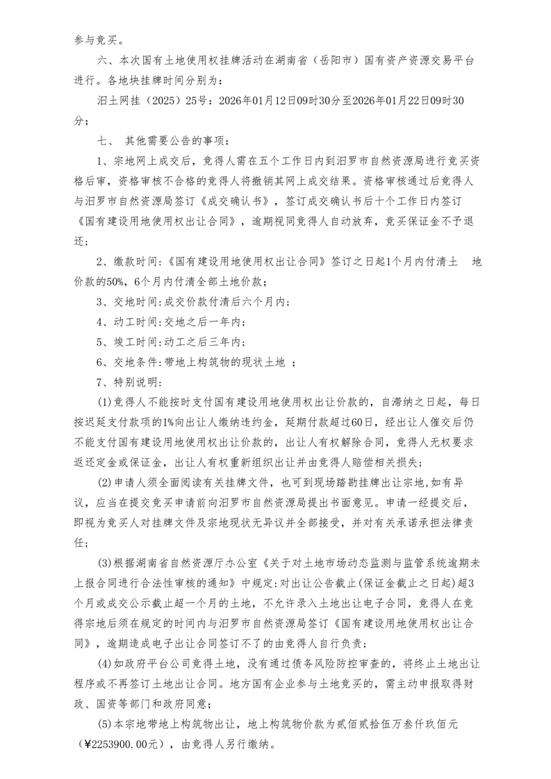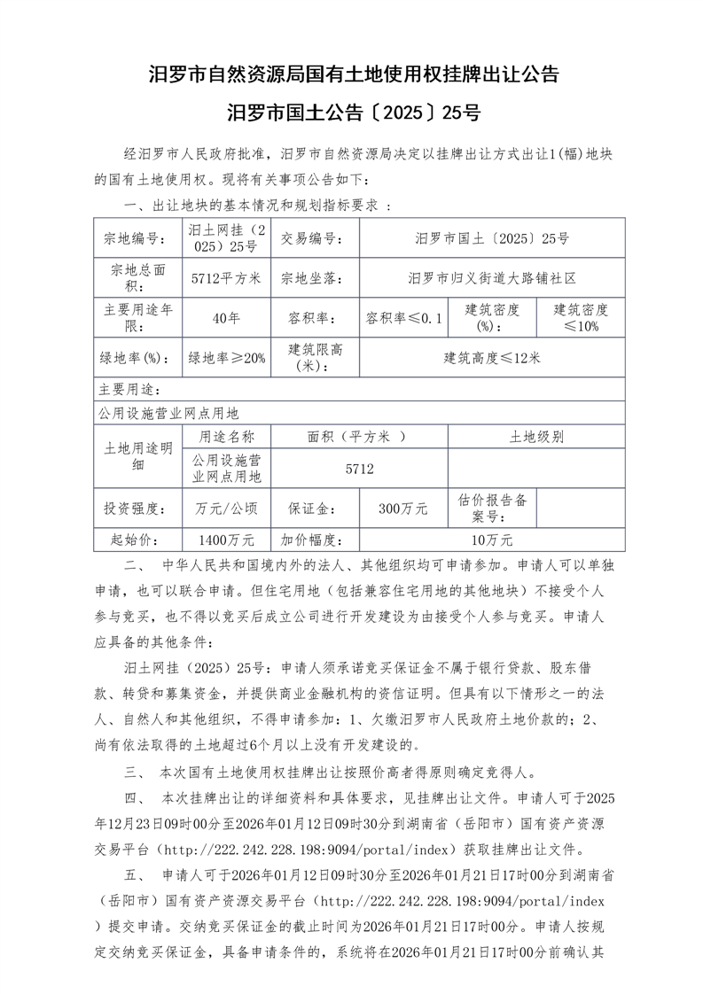 国有土地使用权挂牌出让公告汨罗市国土公告[2025〕25号