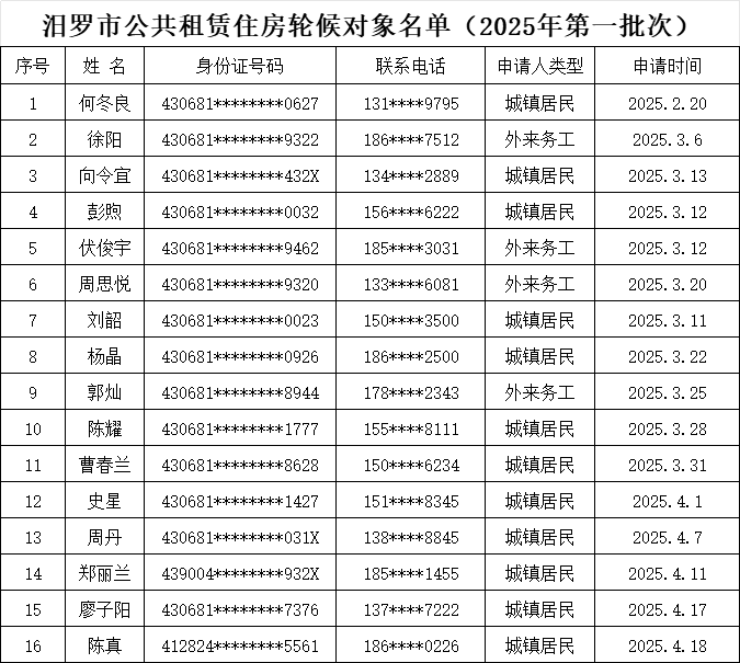 兹有何冬良、徐阳等16户申请公共租赁住房实物配租家庭,根据《岳阳市公共租赁住房管理办法》相关规定,经社区、乡镇等相关单位初审,基本符合条件。经市住房保障服务中心复审,以上申请家庭符合我市公共租赁住房实物配租条件,现予以公示。公示期为七天:2025年5月6日至2025年5月14日止。公示期间,如有异议,请在公示期内以电话或书面形式向我局反馈: