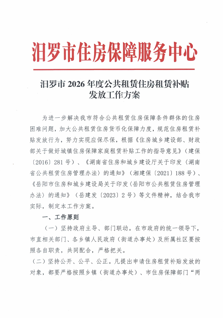 汨罗市2026年度公共租赁住房租赁补贴发放工作方案