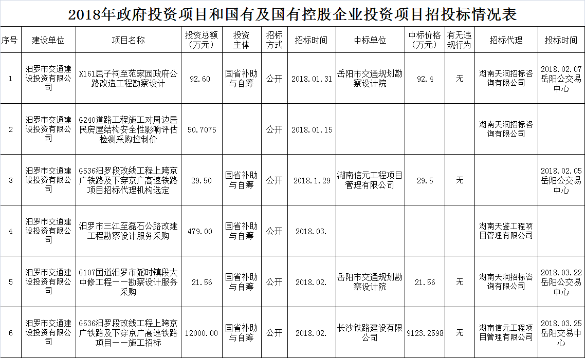 2018年政府投资项目和国有及国有控股企业投资项目招投标情况表
