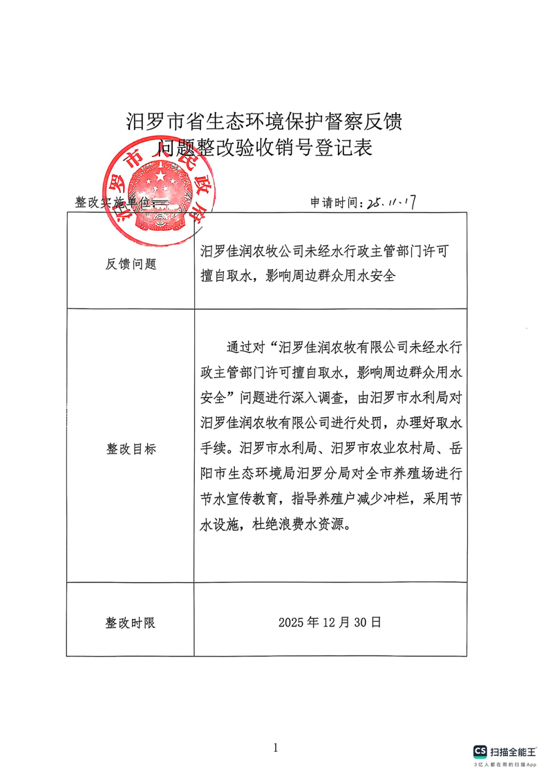 汨罗市省生态环境保护督察反馈问题整改验收销号登记表