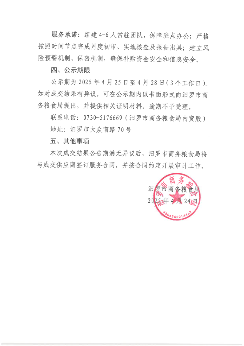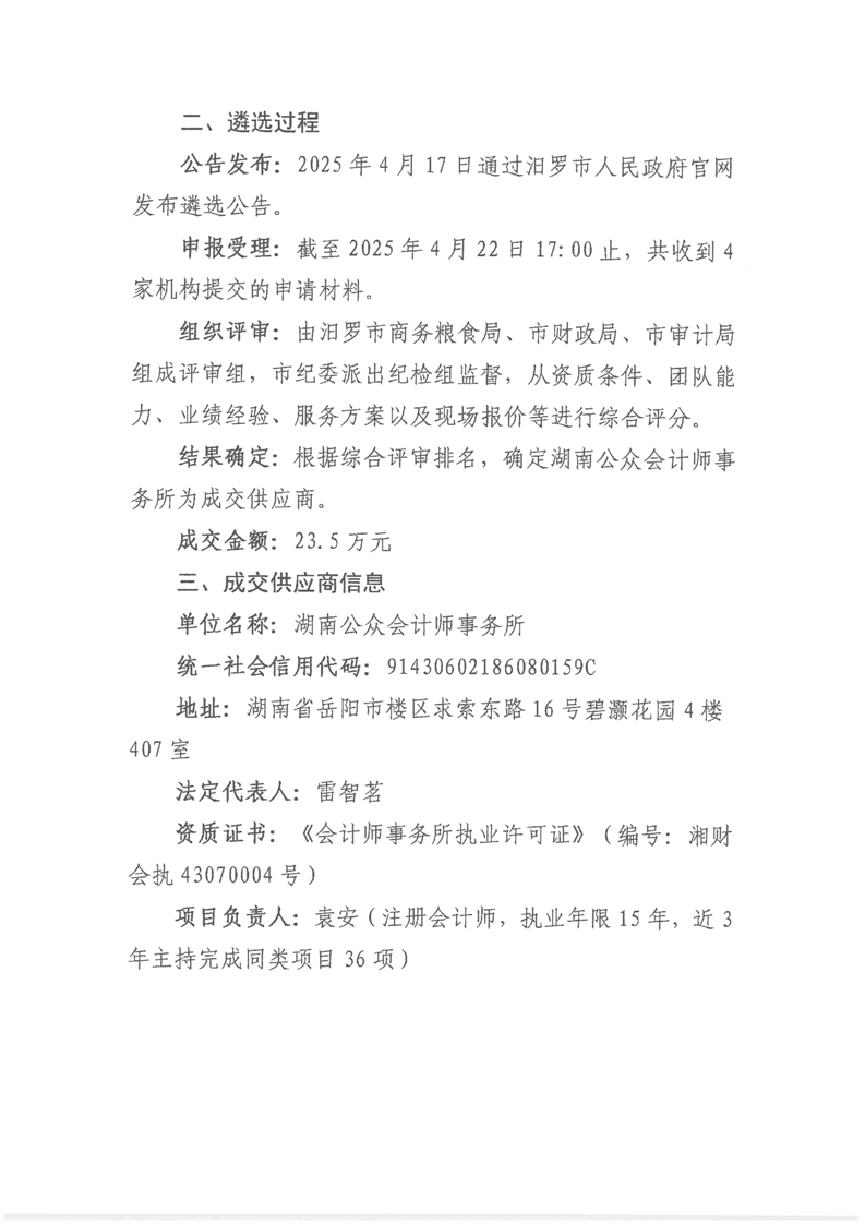 汨罗市商务粮食局2025年消费品以旧换新活动审计服务项目竞争性磋商采购成交结果公告