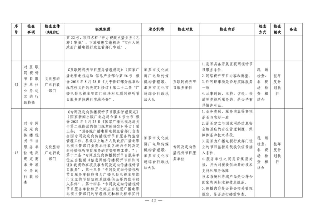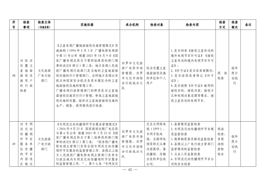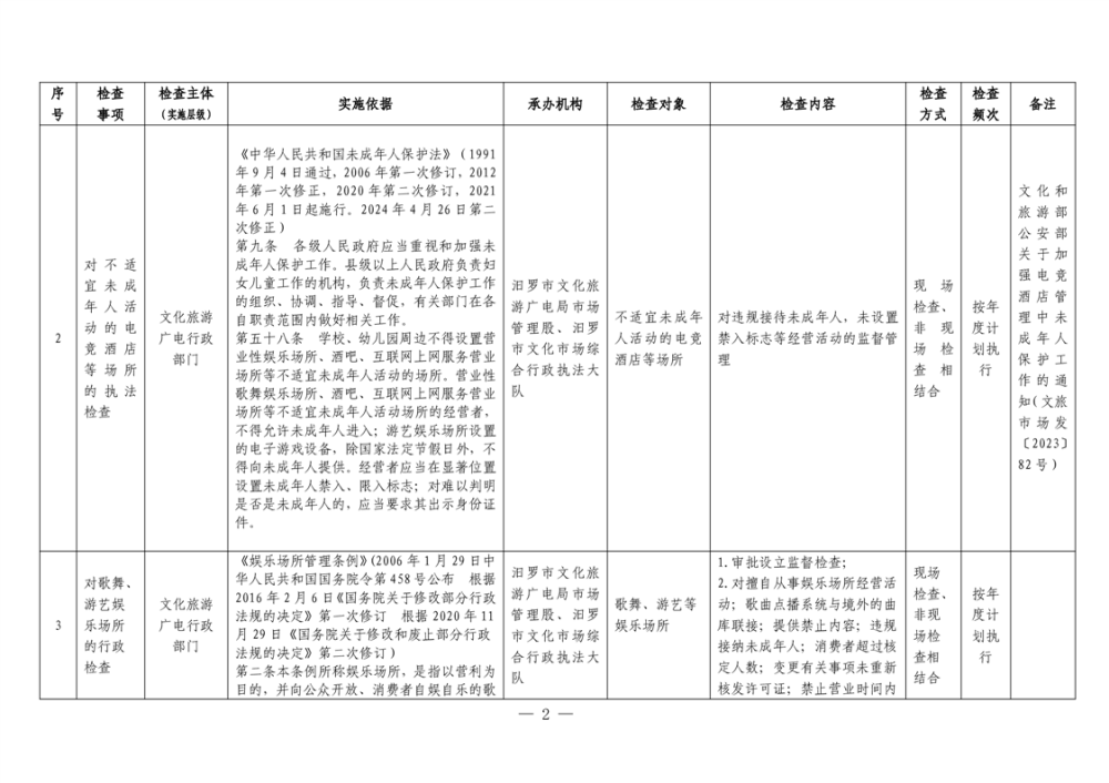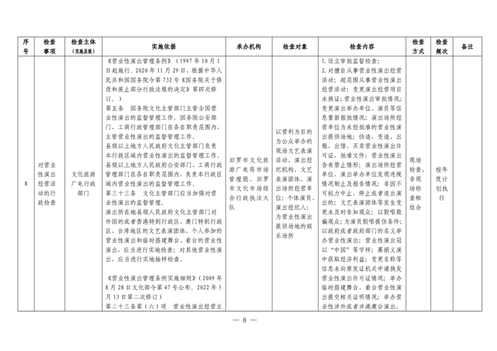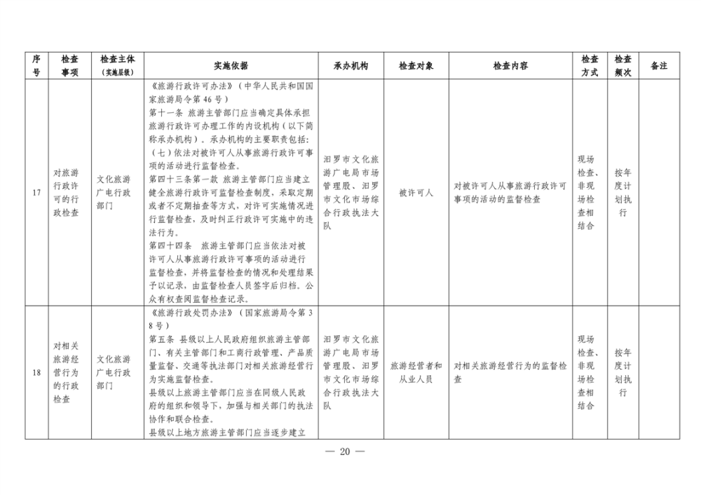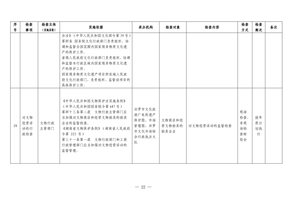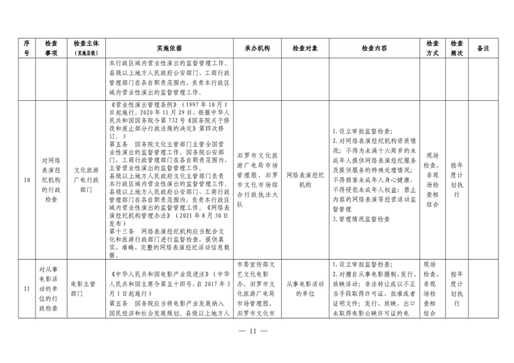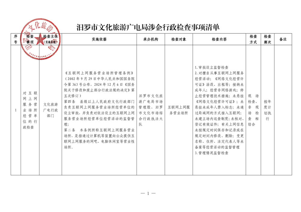 汨罗市文化旅游广电局涉企行政检查事项清单