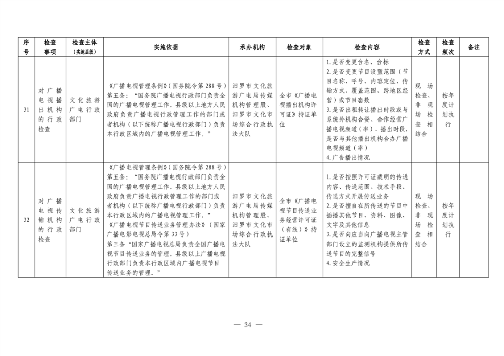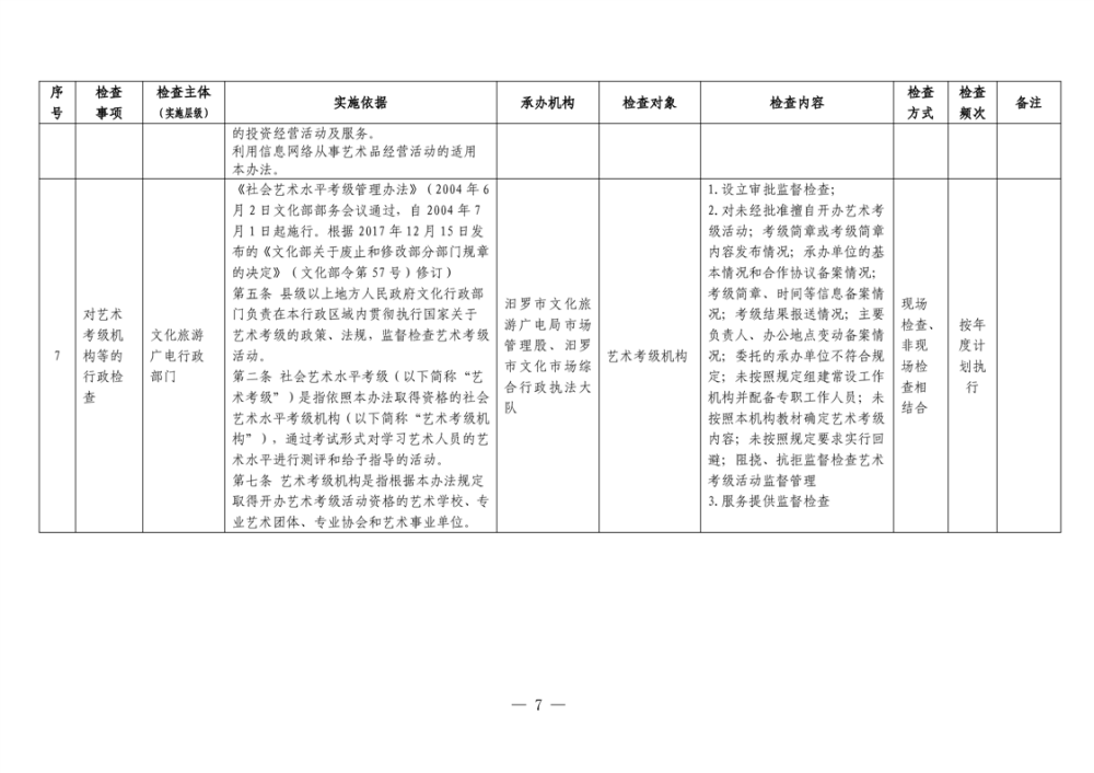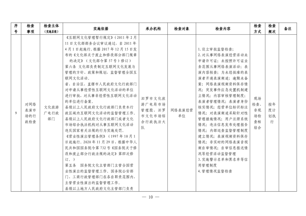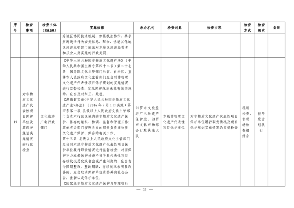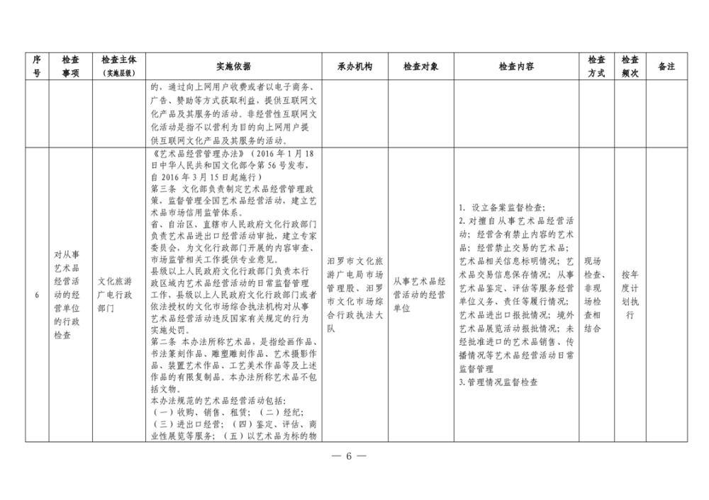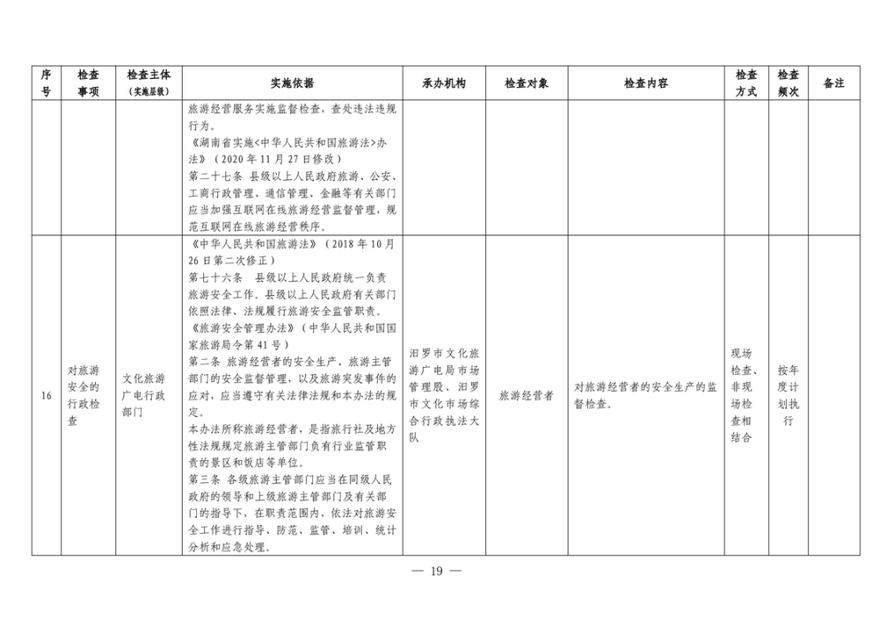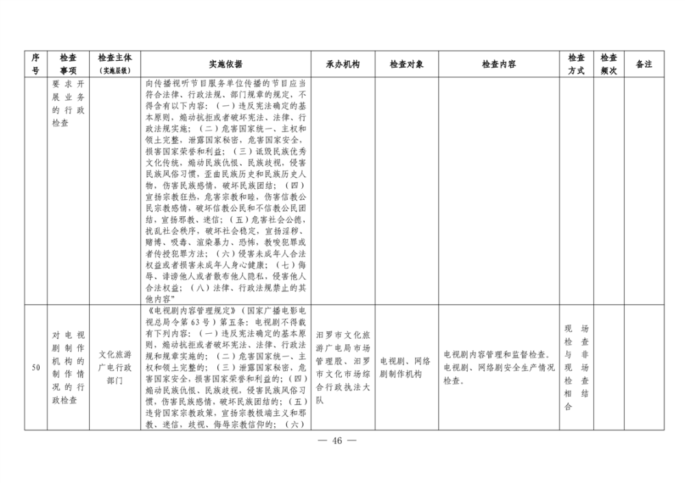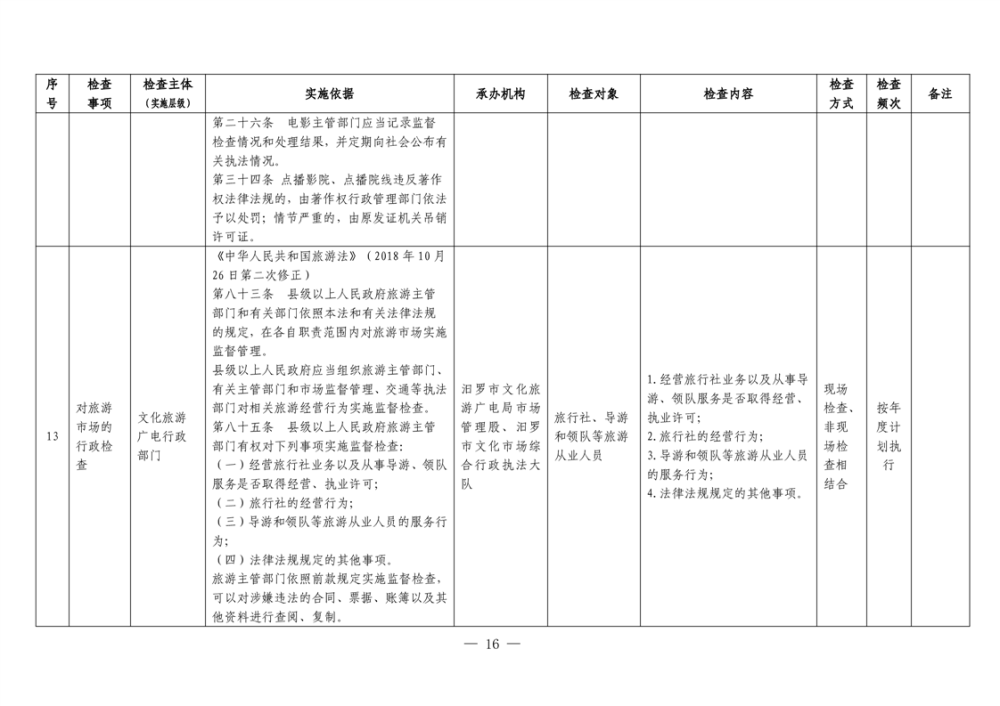 汨罗市文化旅游广电局涉企行政检查事项清单
