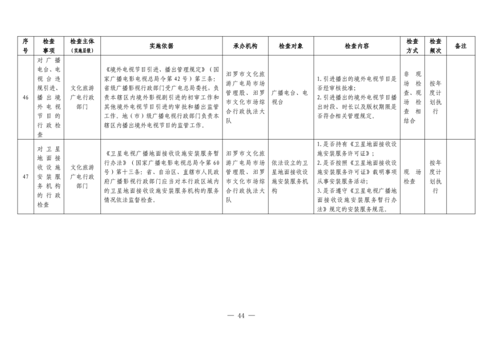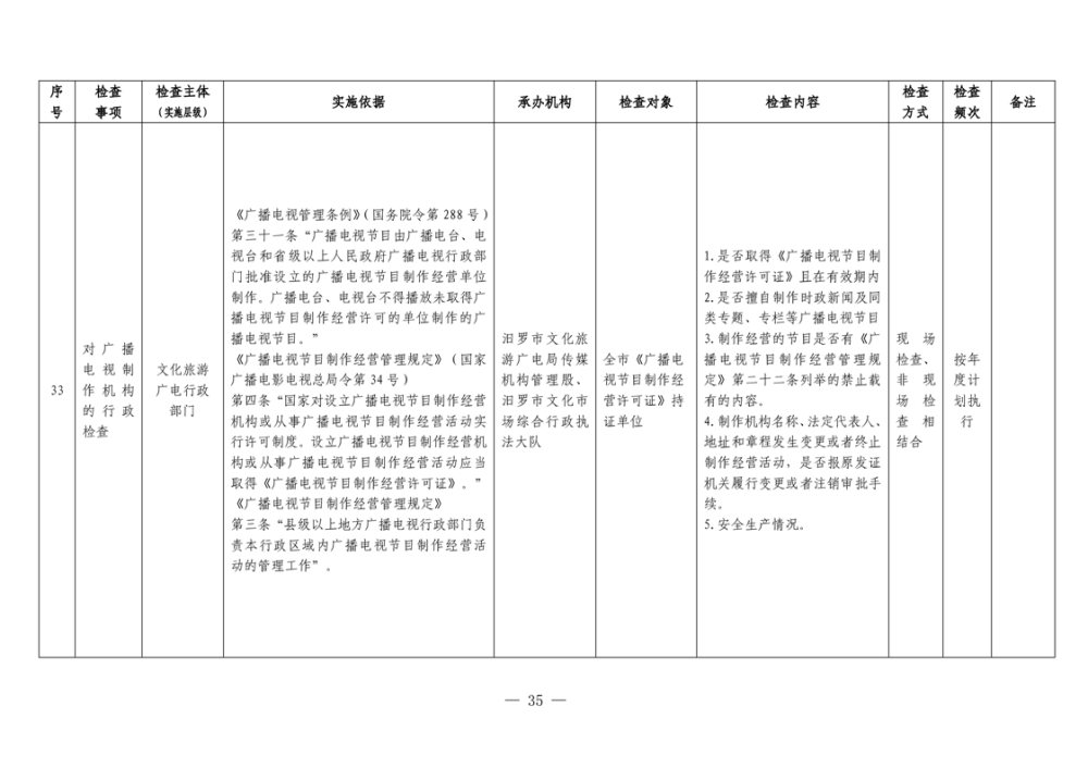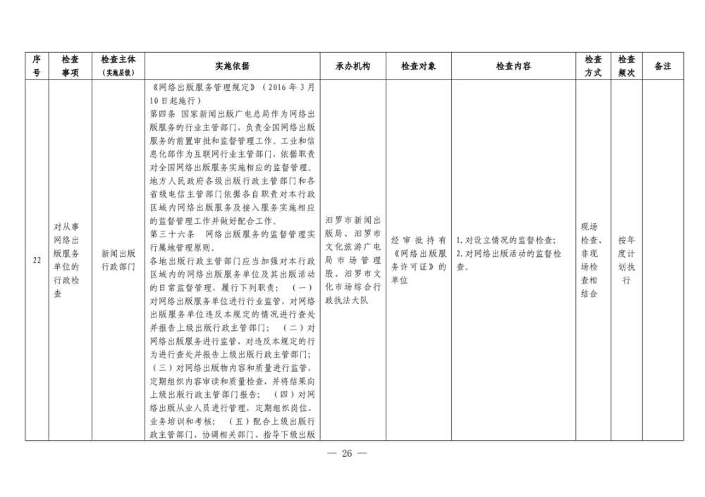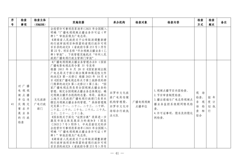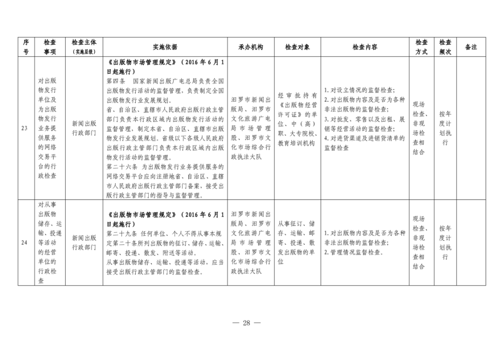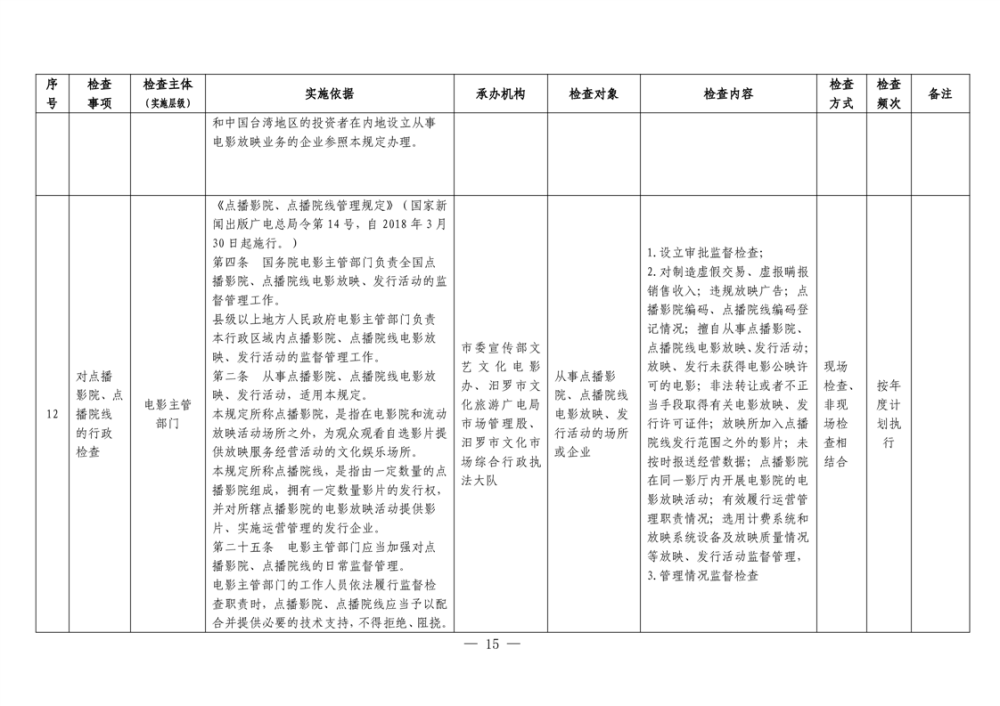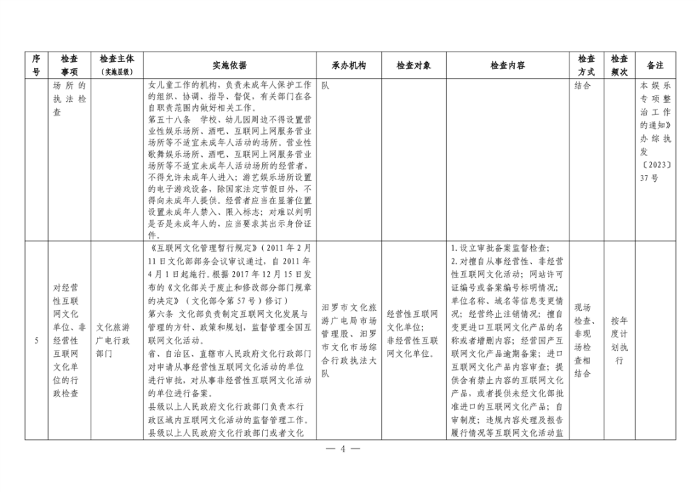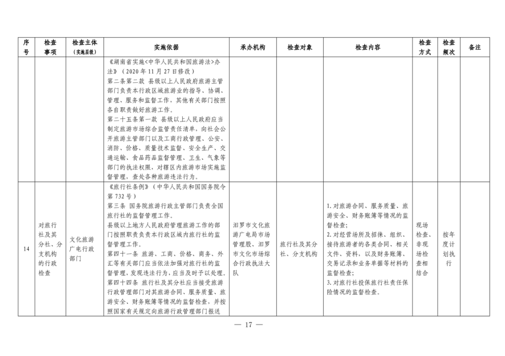 汨罗市文化旅游广电局涉企行政检查事项清单