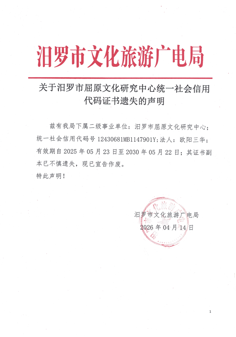 关于汨罗市屈原文化研究中心统一社会信用代码证书遗失的声明