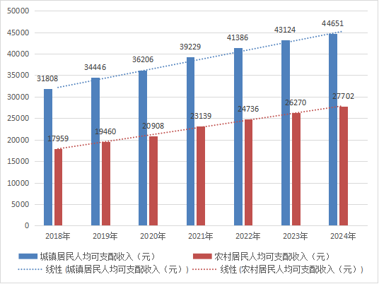 图4 2018-2024年城镇居民人均可支配收入和农村居民人均可支配收入