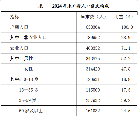 年末全市户籍人口658304人,其中男性343875人,女性314429人。总人口中18岁以下人员123831人,18-35岁人员115509人,35-59岁人员257932人,60岁及以上人员161032人。全年出生3696人,其中男性1961人,女性1735人,出生率为5.36‰。死亡4796人,其中男性2787人,女性2009人,死亡率6.96‰。人口自然增长率- 1.6‰。