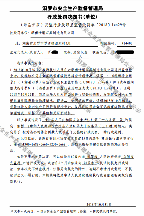 行政处罚决定书(当事人:湖南清渭家具制造有限公司)