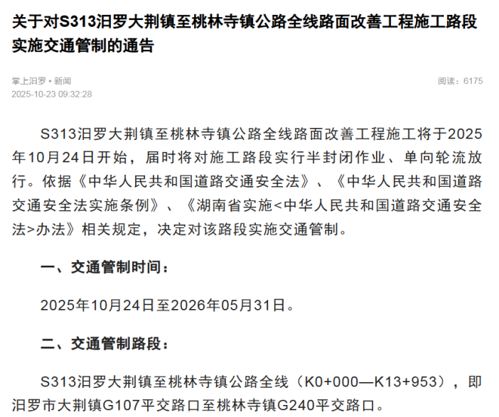关于对S313汨罗大荆镇至桃林寺镇公路全线路面改善工程施工路段实施交通管制的通告