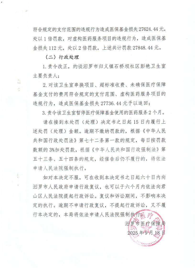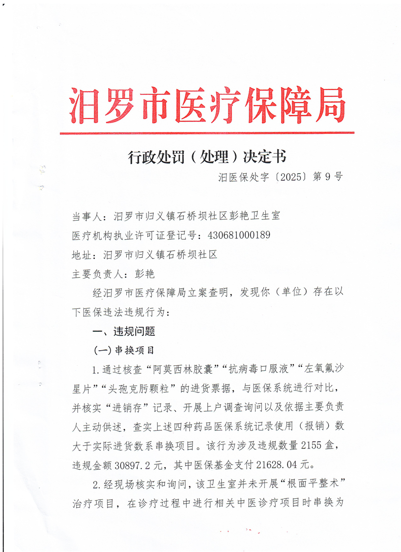 行政处罚(处理)决定书(汨医保处字〔2025〕第9号)