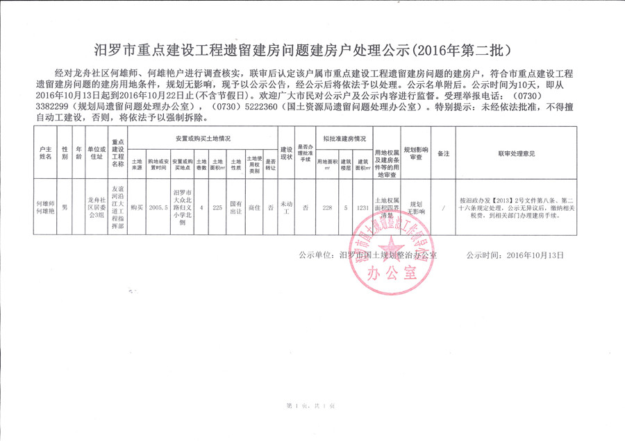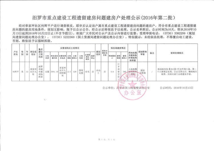 汨罗市重点建设工程遗留建房问题建房户处理公示(2016年第二批)