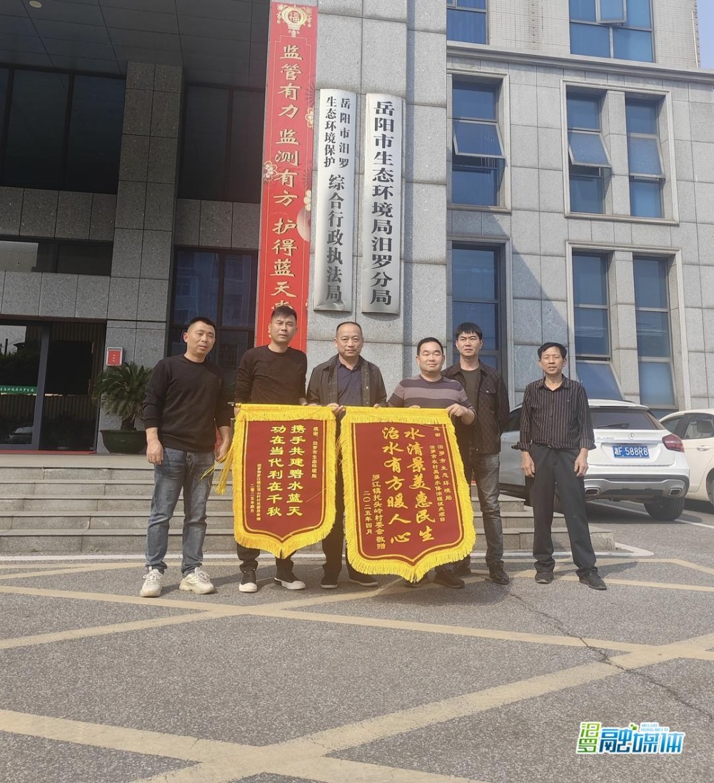 4月8日,岳阳市生态环境局汨罗分局内暖意涌动。罗江镇红花山、托头岭、黄市、尚义、金塘五村村干部代表将写有"水清景美惠民生,治水有方暖人心""携手共建碧水蓝天 功在当代利在千秋"的两面锦旗送至该局,以最质朴的方式表达村民对黑臭水体治理成效的认可。