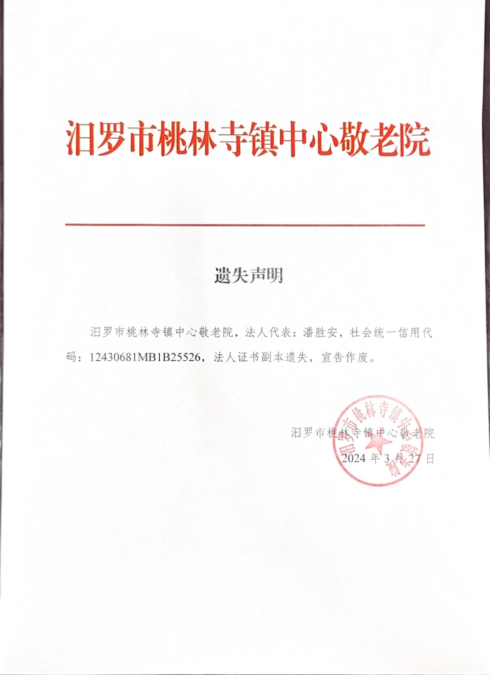 汨罗市桃林寺镇中心敬老院关于法人证书副本的遗失声明