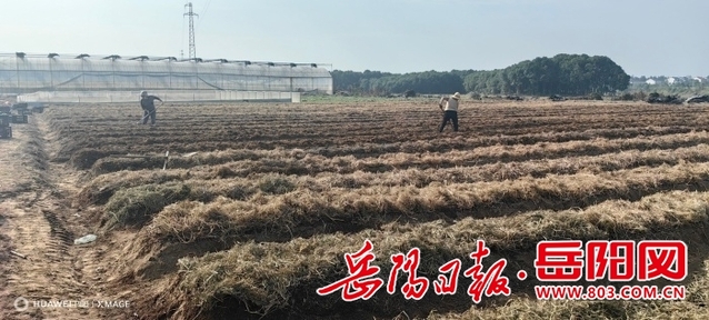 地头一侧大棚内,一排排栽培菌菇的畦床整齐排列。湖南省蔬菜产业技术体系食用菌岳阳试验站的技术人员周威正在现场指导:“盖草务必均匀,厚度控制在5厘米左右,这样才能有效保温保湿,为菌丝生长创造理想环境。”他特别叮嘱公司负责人熊岳飞,当前正值菌丝萌发的关键阶段,必须精准控制湿度、及时清理排水沟,严防积水影响菌丝发育。