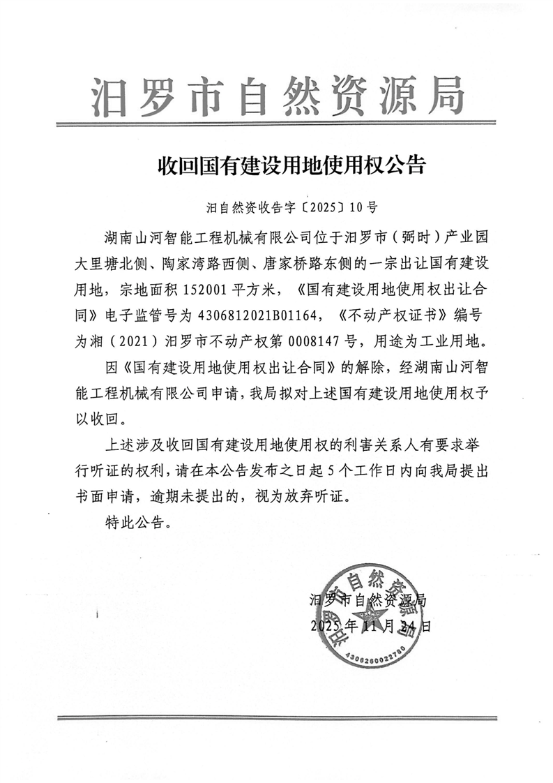 收回国有建设用地使用权公告(电子监管号4306812021B01164)