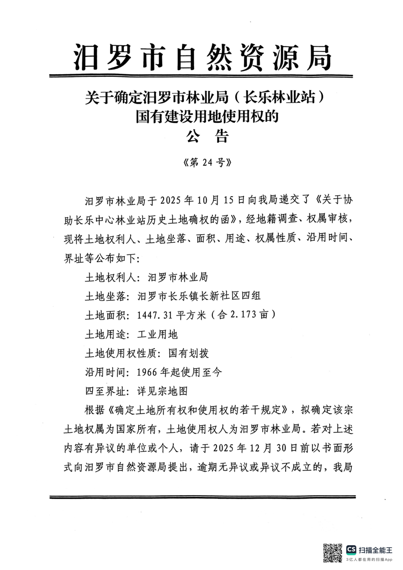关于确定汨罗市林业局(长乐林业站)国有建设用地使用权的公告