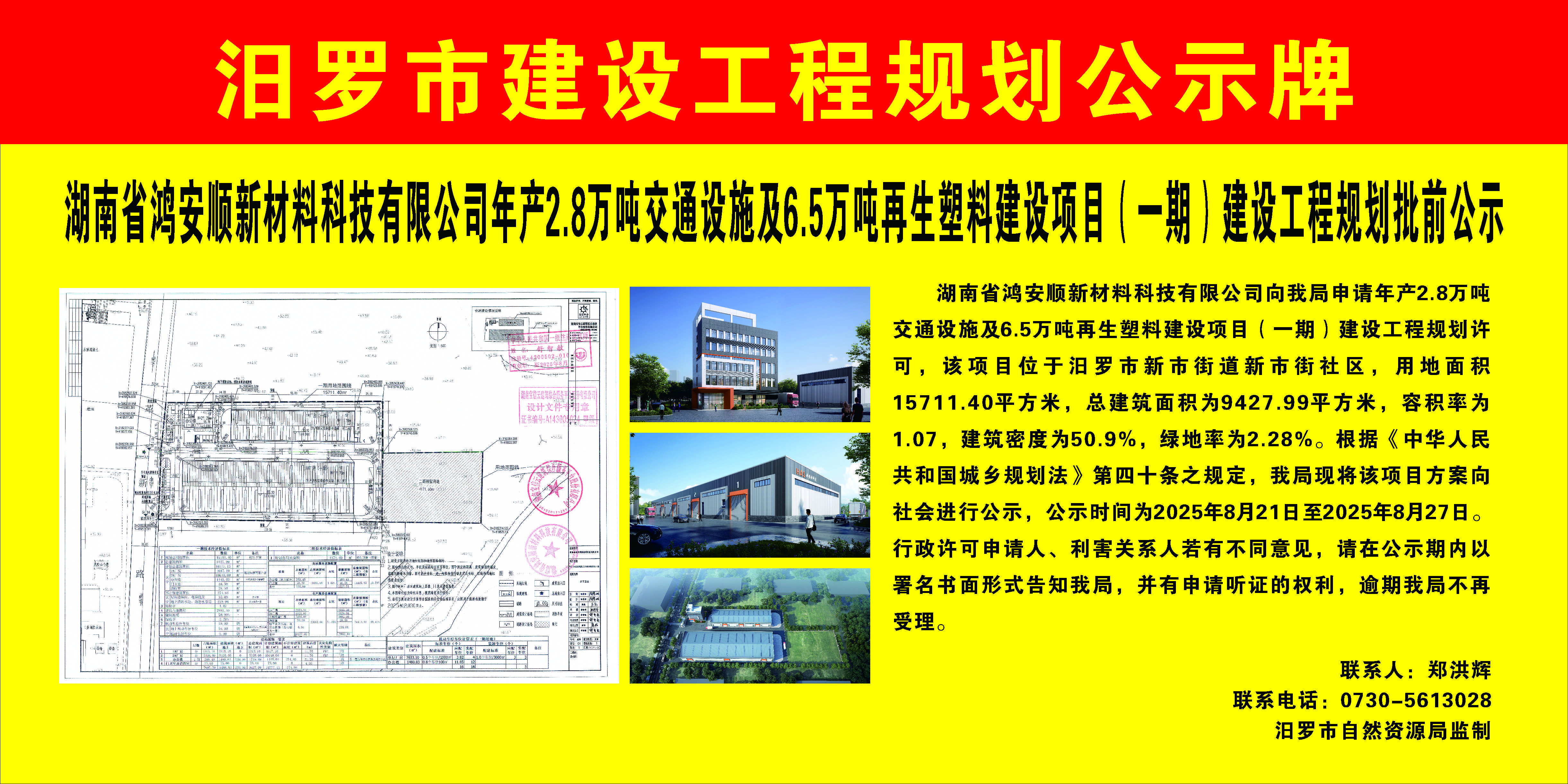 湖南省鸿安顺新材料科技有限公司年产2.8万吨交通设施及6.5万吨再生塑料建设项目(一期)建设工程规划批前公示