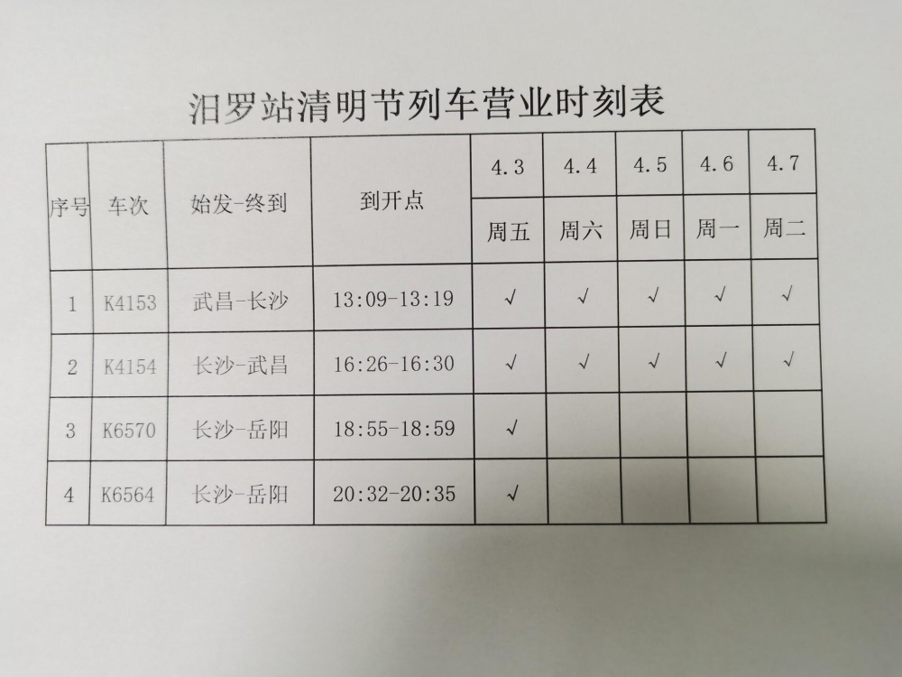 • K4154次(长沙-武昌):汨罗站到开时间为16:26-16:30,4月3日至7日每日开行;