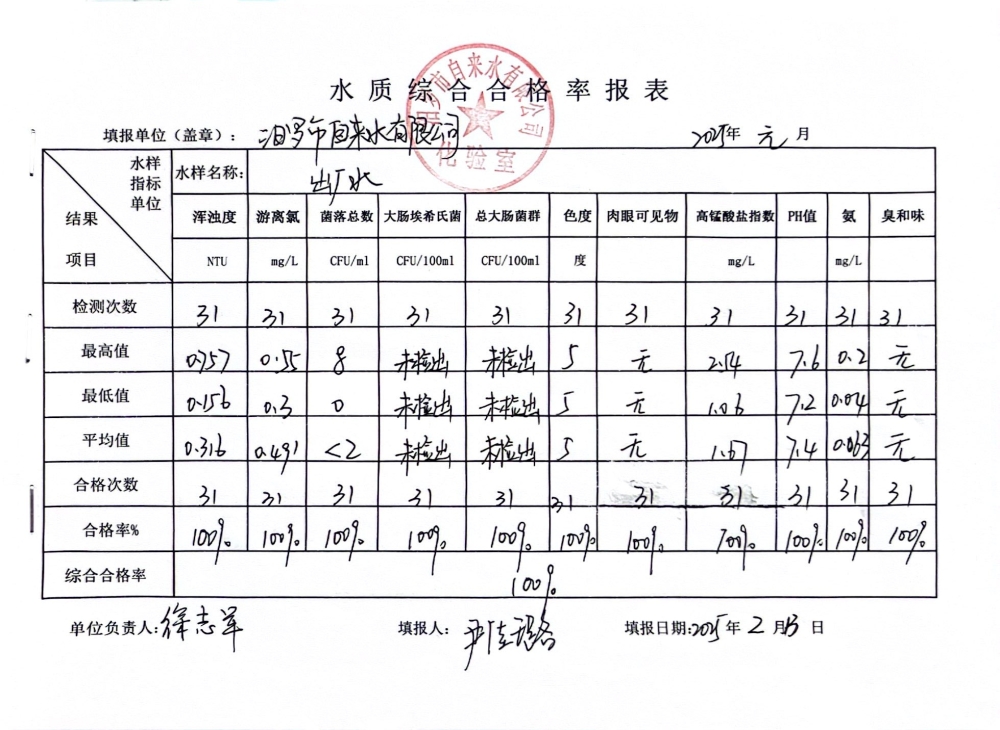 2025年3月份汨罗市自来水有限公司水质综合合格率报表