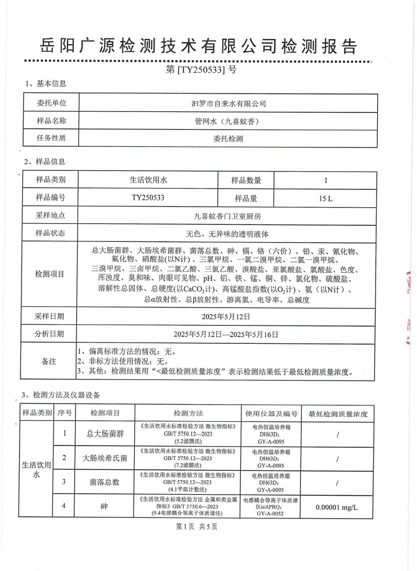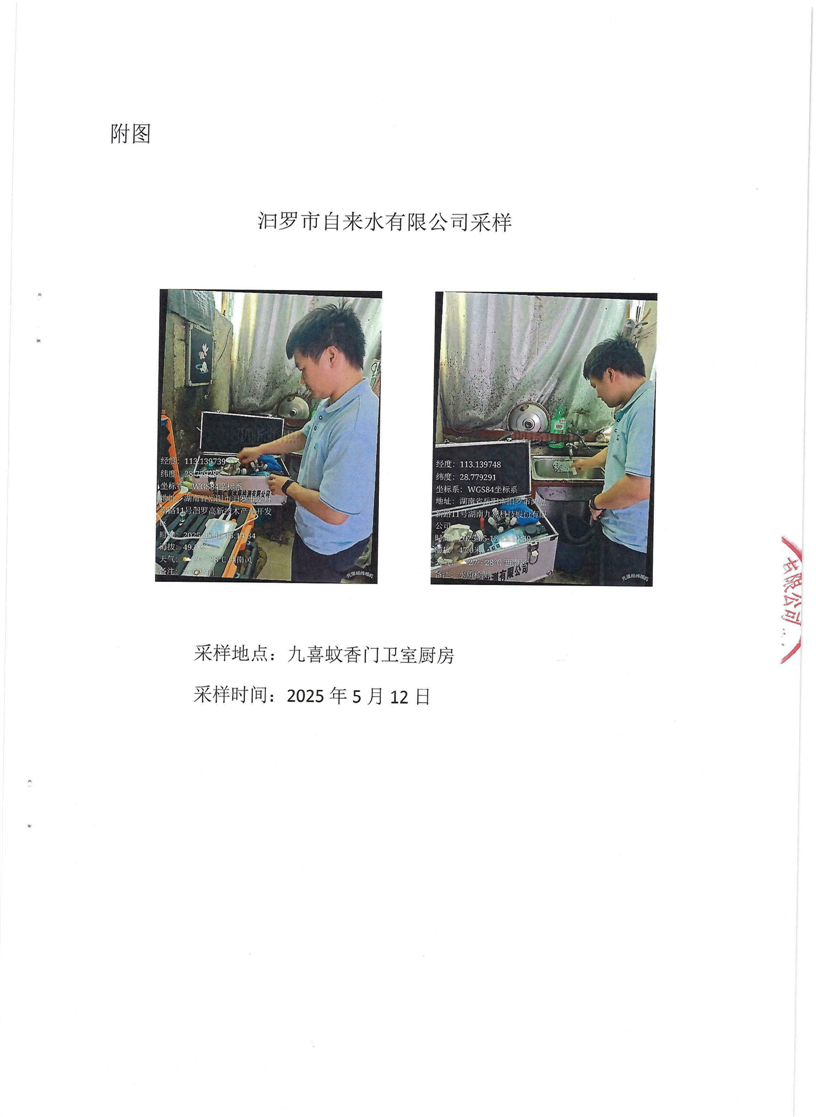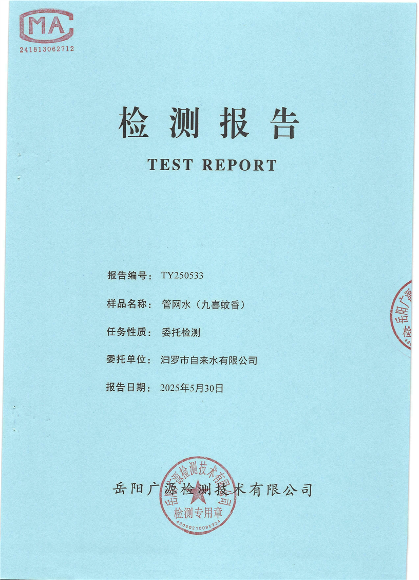 2025年5月份汨罗市自来水有限公司管网水(九喜蚊香)质检月报表