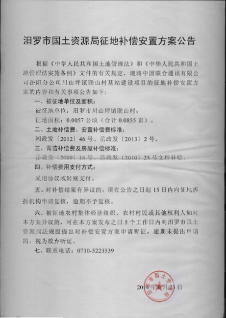 川山坪镇联山村联通基站建设项目补偿安置方案公告