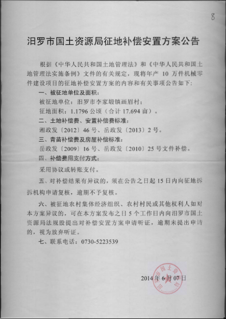 李家塅画眉村年产10万件机械零件补偿安置方案公告