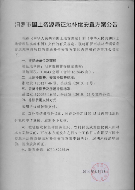 桃林寺镇东塘村敬老养老院建设补偿安置方案公告