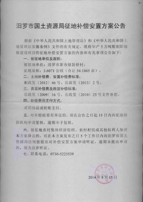 新市镇新桥村年产5万吨粗铜阳极板建设补偿安置方案公告