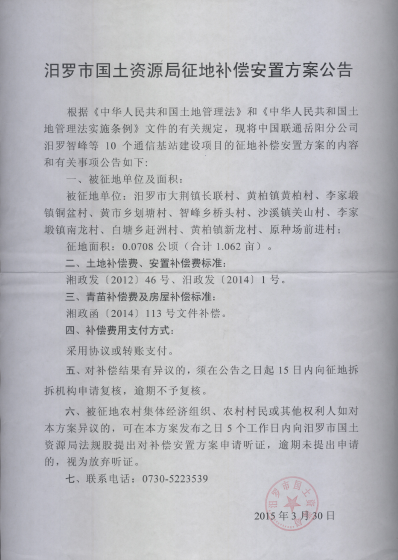 中国联通岳阳分公司汨罗智峰等10个通信基站建设项目征地补偿安置方案公告