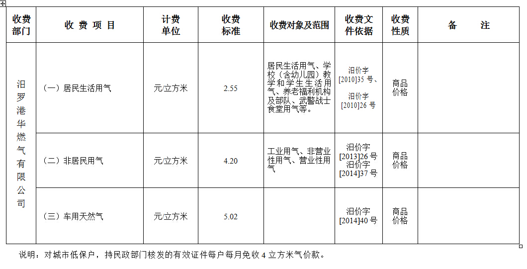 汨罗市城区天然气销售价格表