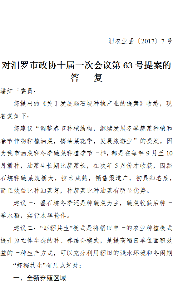 农业局对汨罗市政协十届一次会议第63号提案的答复