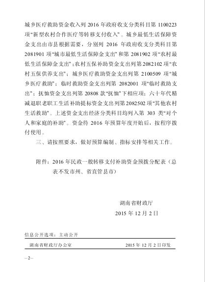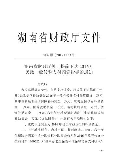 湘财预〔2015〕133号2016年民政一般转移支付预算指标的通知