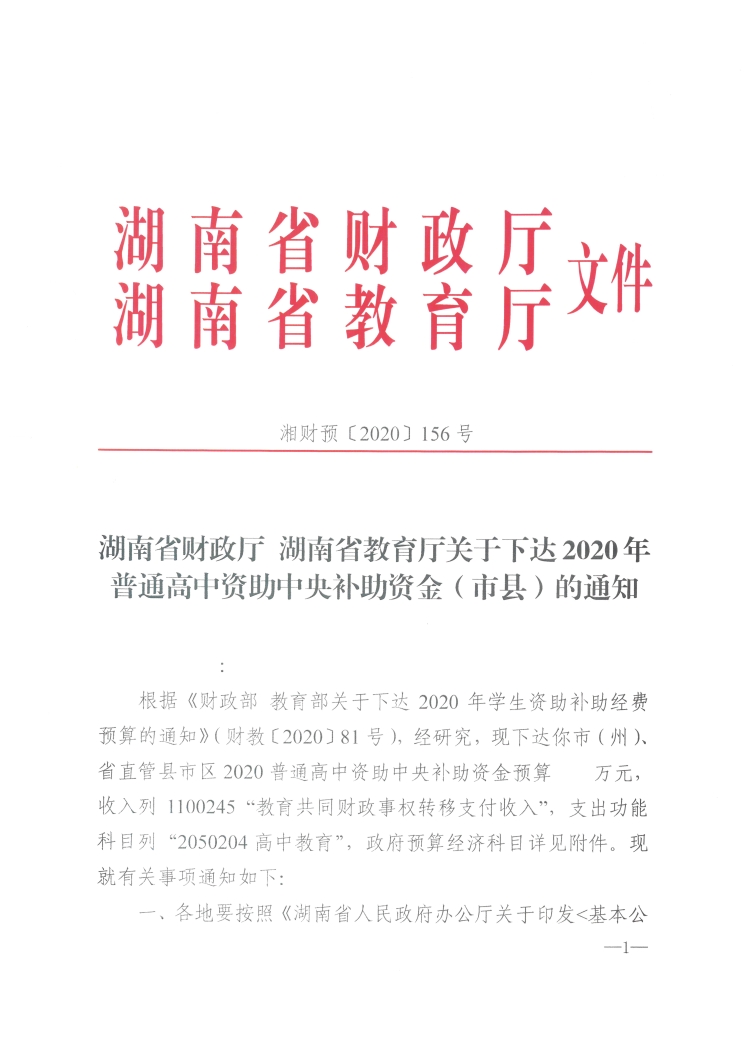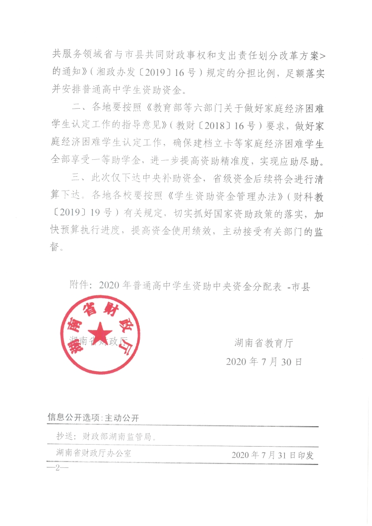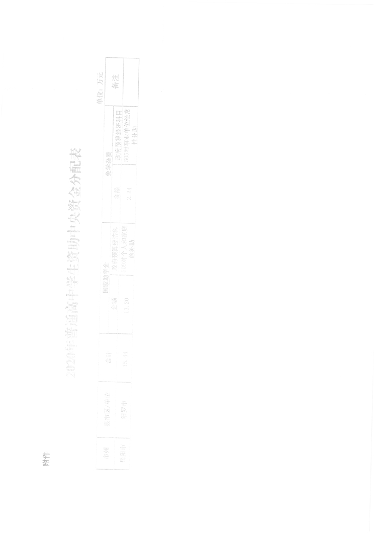 关于下达2020年普通高中资助中央补助资金(市县)的通知)