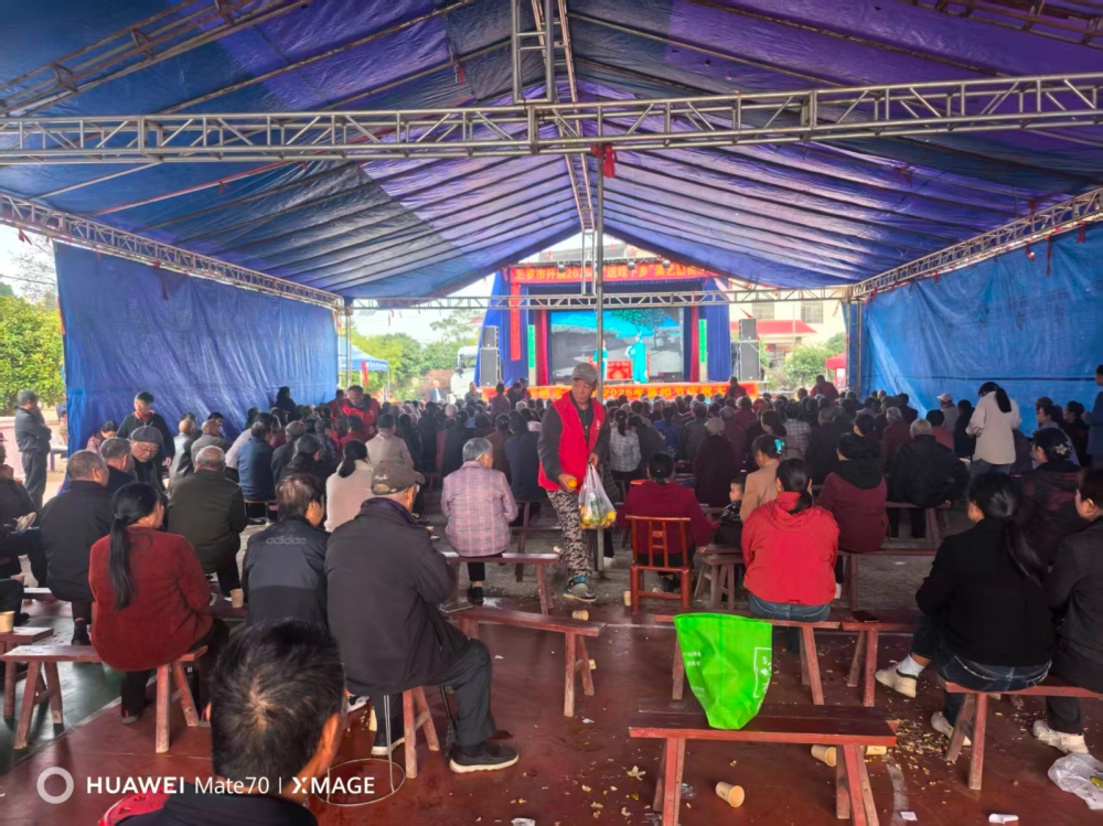与往年不同,今年活动以“敬老爱老、文明节俭”为主题,聚焦移风易俗。支村“两委”干部早早到场,和市花鼓戏剧团一起搭舞台,还特意搭建400余平方米的挡风帐篷,配备带靠背的座椅,细节处尽显贴心。“老人们爱听花鼓戏,我们提前半年谋划,动员乡友捐资5万元请专业剧团,还为老人发20个鸡蛋。”村党总支书记刘勋介绍。