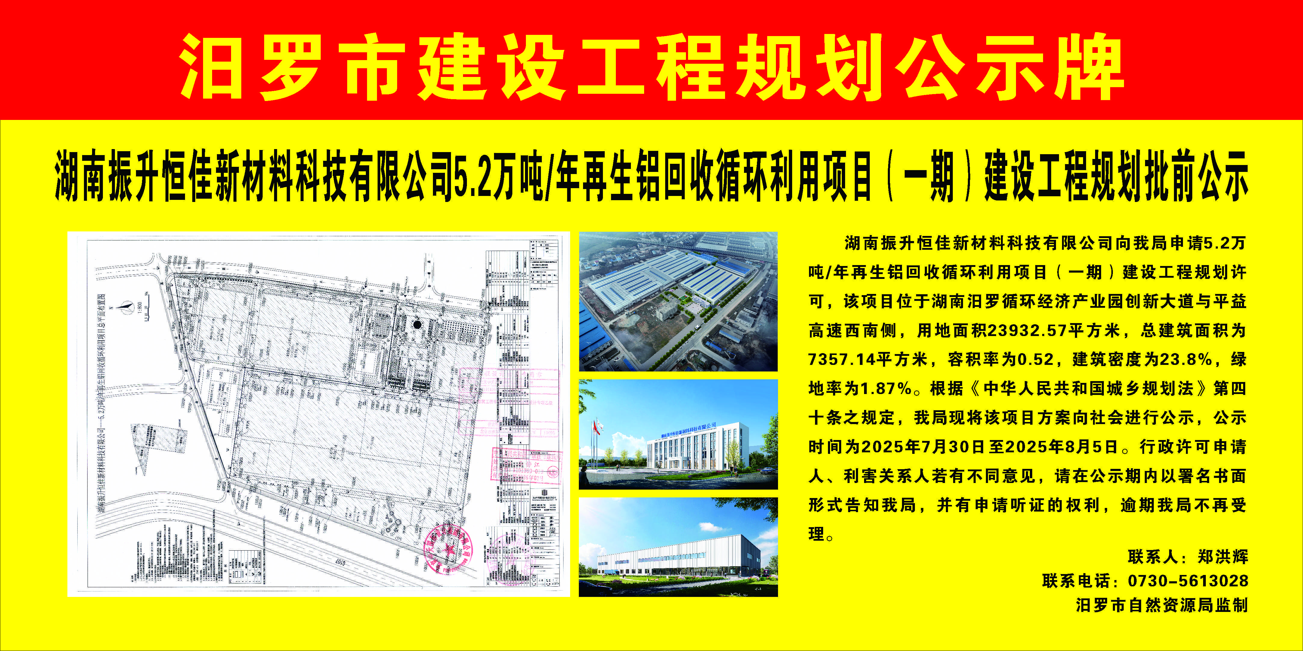 湖南振升恒佳新材料科技有限公司5.2万吨/年再生铝回收循环利用项目(一期)建设工程规划批前公示