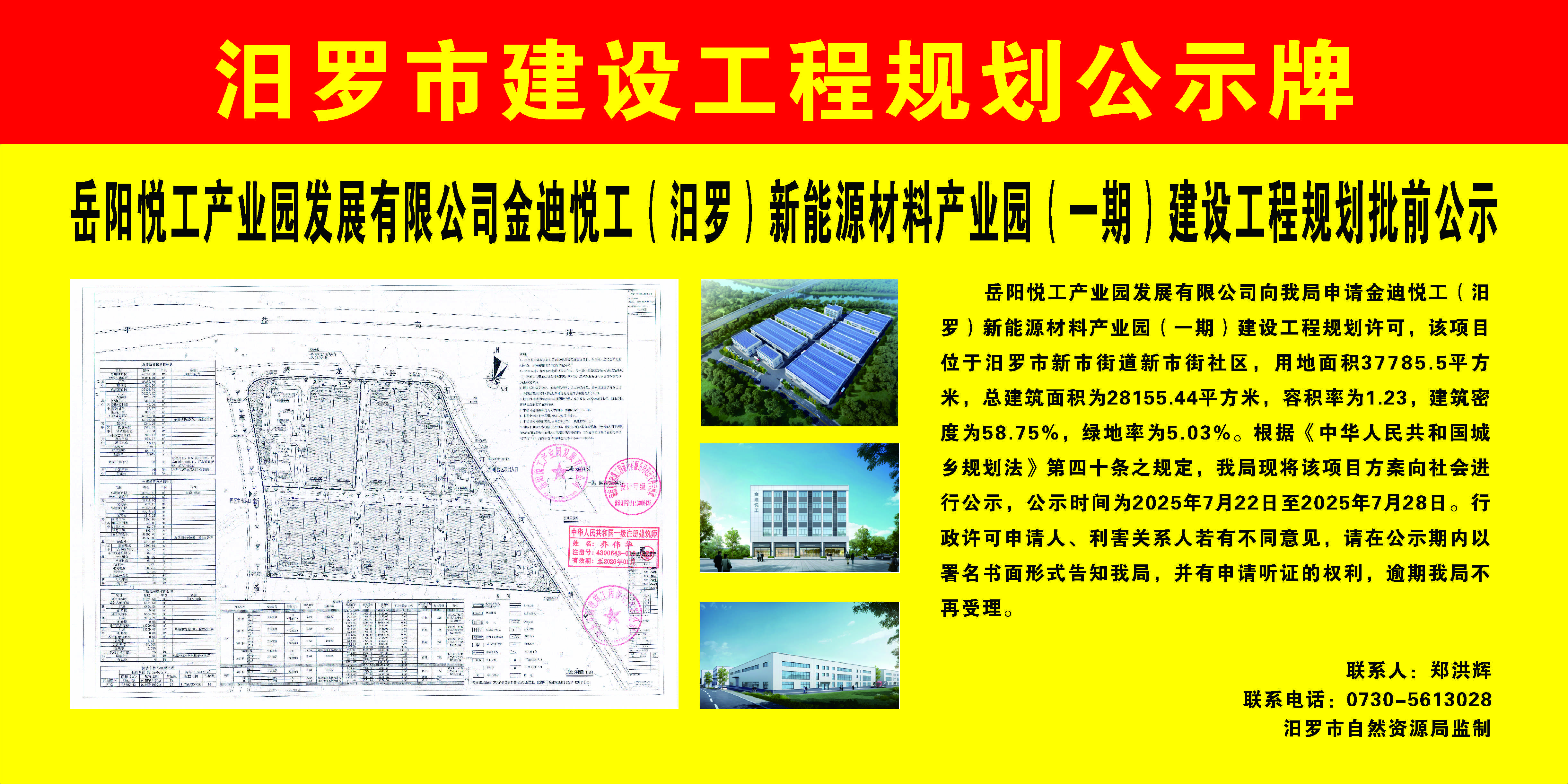 岳阳悦工产业园发展有限公司金迪悦工(汨罗)新能源材料产业园(一期)建设工程规划批前公示