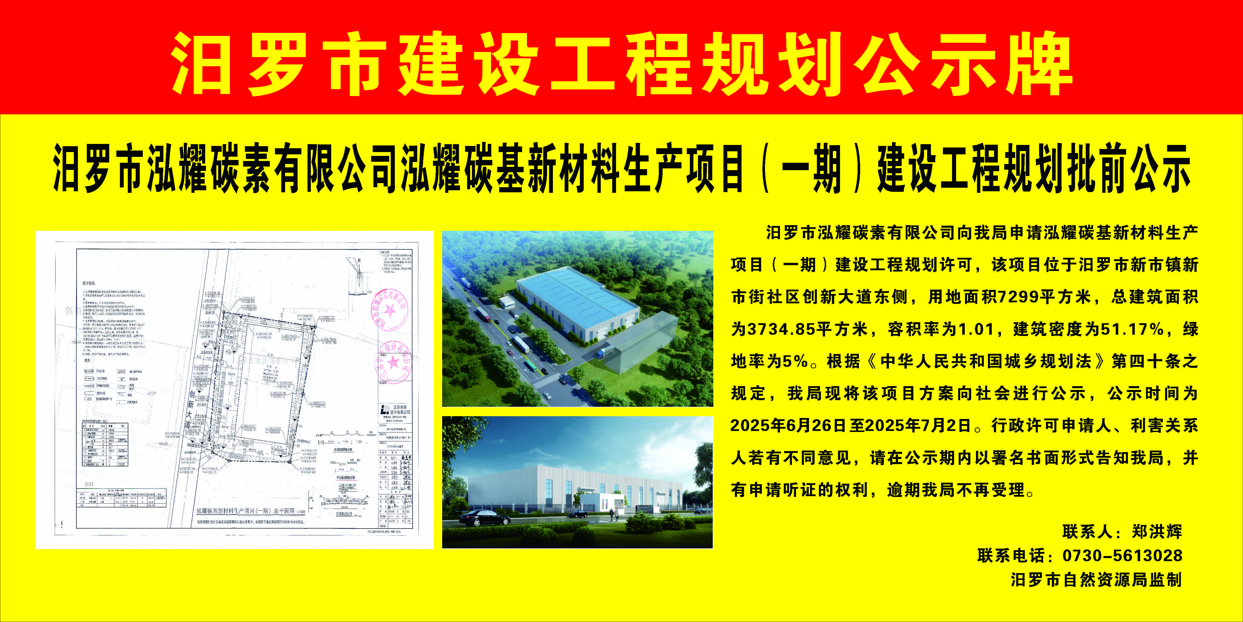 汨罗市泓耀碳素有限公司泓耀碳基新材料生产项目(一期)建设工程规划批前公示