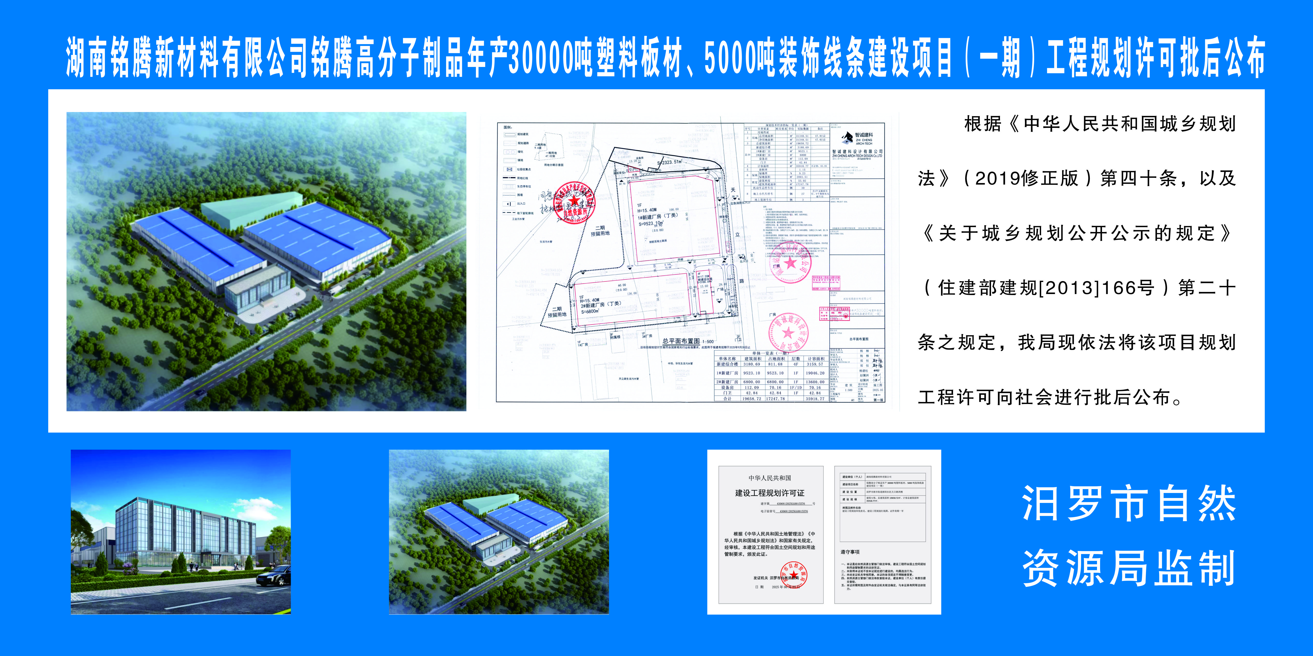 湖南铭腾新材料有限公司铭腾高分子制品年产30000吨塑料板材、5000吨装饰线条建设项目(一期)工程规划许可批后公布