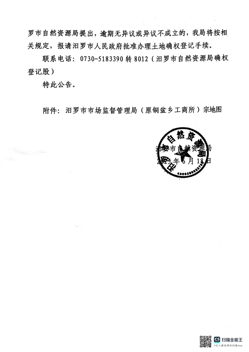 关于确认汨罗市市场监督管理局(原铜盆乡工商所)国有建设用地使用权的公告
