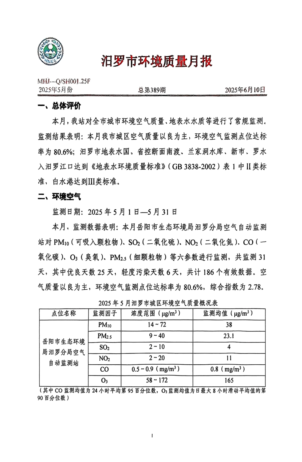 汨罗市环境质量月报(2025年5月份)